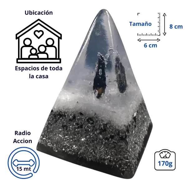 Se recomienda para espacios con mucha densidad energética, ya que la punta de turmalina potencia la acción del orgonito realizando una limpieza profunda de los espacios circundantes. Puede usarse en la entrada de la casa, en la habitación, debajo de la cama, en la mesa de la cocina, cerca del televisor o el emisor de wifi.