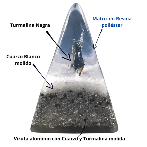 Componentes: Punta cristalina en la parte superior deja ver punta de turmalina. Mezcla de aluminio fino, turmalina molida y cuarzo. Turmalina en la base.