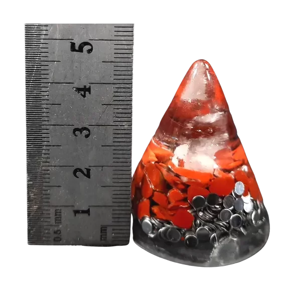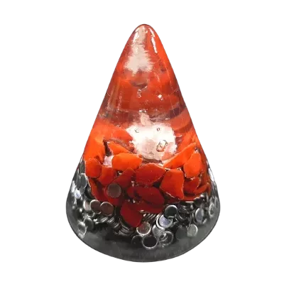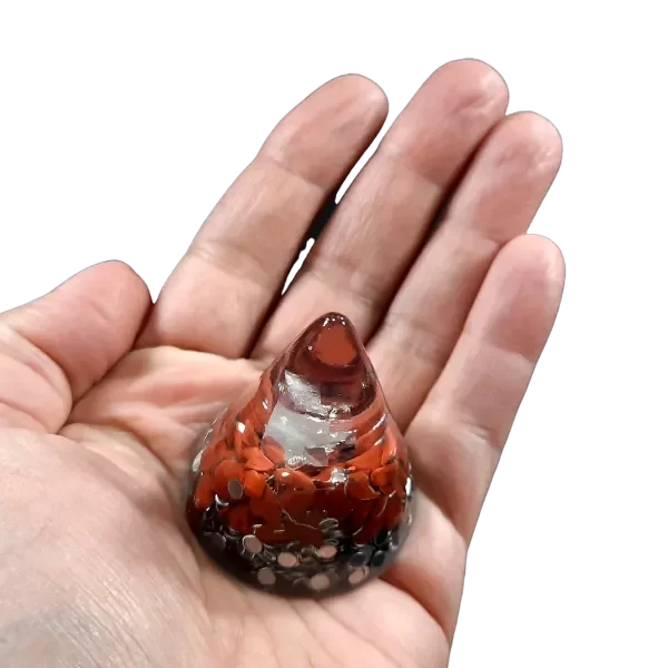 Se caracteriza por ser un orgonite propicio para ubicar en distintos espacios como: habitaciones, sala de estudio, mesita de luz, debajo de la cama, ya que sirve como complemento de orgonites que estén en otros espacios de la casa, y se lo puede trasladar de un lugar a otro, interactuando en espacios reducidos con una estética adecuada para no pasar desapercibido. Componentes: Punta traslucida que deja ver punta de cristal. Capa de jaspe rojo tipo escarla. Matriz de viruta de aluminio Radio de Acción: Hasta 4 mts de diámetro en espacio abierto.