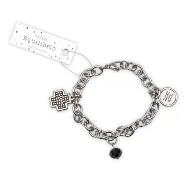 Pulsera de cadena de acero con dijes de cruz del Equilibrio y medalla con frase.