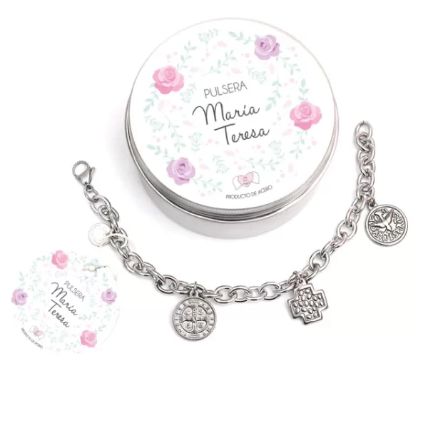 Pulsera de cadena con dijes, todo en acero quirúrgico. Tiene dijes del Espíritu Santo para que te guíe, una cruz del Equilibrio y una medalla de San Benito que te protege. Es una opción hermosa para regalar o auto regalarse, ideal para usar todos los días.