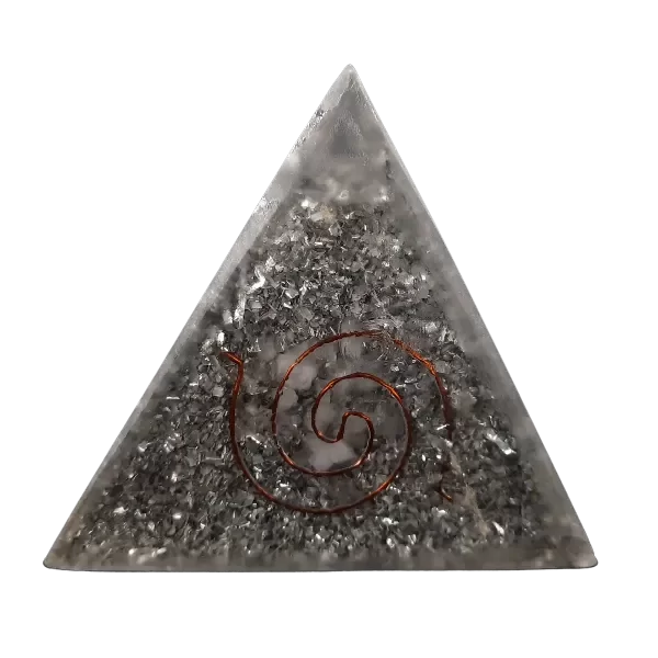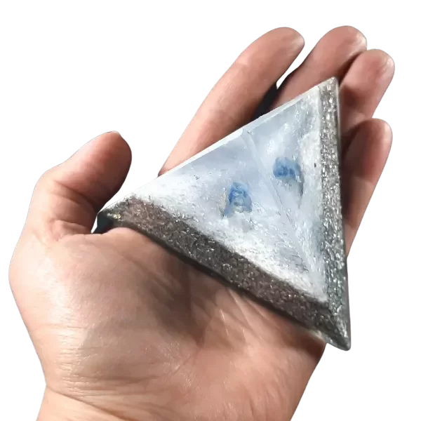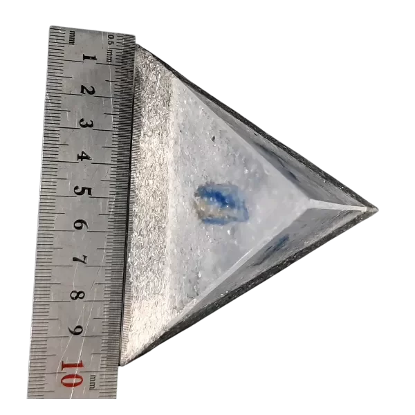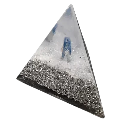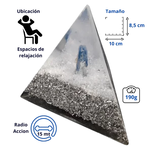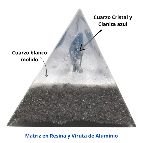 Componentes: Punta traslucida con color que deja ver punta de cristal de cuarzo y cianita azul. Capa de aluminio con cuarzo blanco, y espiral de cobre en la base.