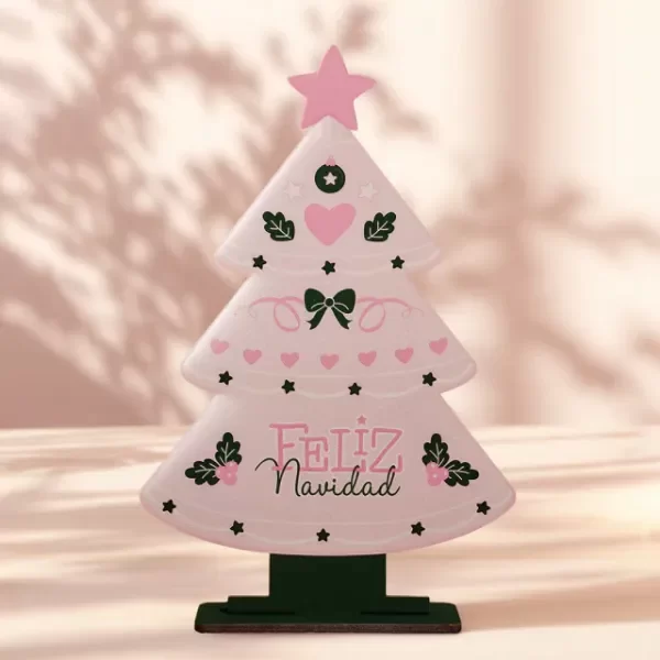Arbolito encastrable de madera con diseño original en tonos rosados y verdes. Ideal para crear tu propia navidad pink 💕. Además, viene con una tarjeta hermosa que lo convierte en un regalo con mucho corazón.