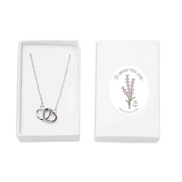 Delicado collar de acero quirúrgico con dije de dos corazones con circonia enlazados 💕. Un accesorio hipoalergénico y resistente al agua que simboliza unión y amor eterno. Viene presentado en una cajita de cartón reutilizable con un sticker exclusivo con la frase “El amor nos une”. Es el detalle perfecto para transmitir cariño y conexión en cualquier momento del año.