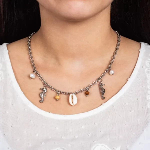 Collar de acero súper canchero, inspirado en el océano, con dijes de caballito de mar, perlas naturales y un caracol. Perfecto para quienes aman llevar un pedacito de la playa a donde vayan.