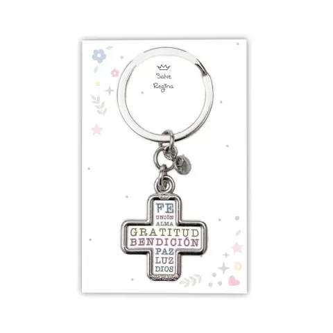 El Llavero Fe tiene forma de cruz con un diseño único que reúne mensajes positivos como Fe, Gratitud, Bendición, Paz, Luz y Amor.