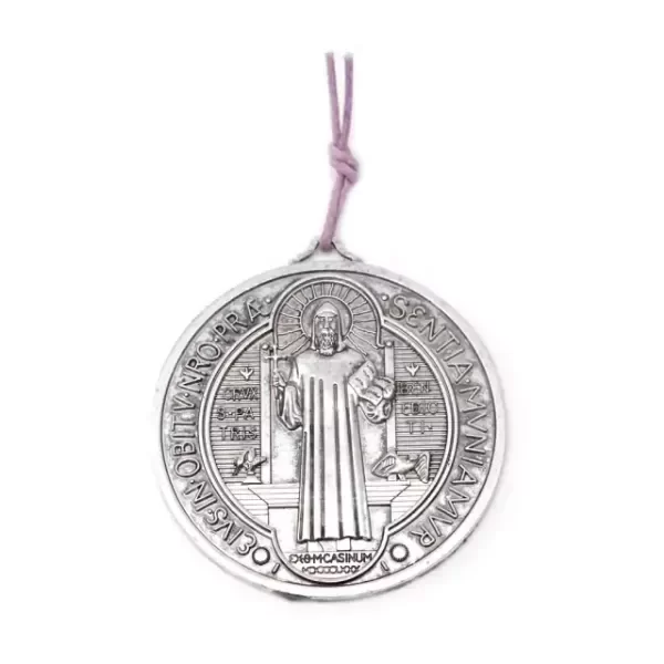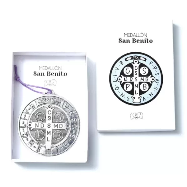 Medallón de metal con la cruz de San Benito de un lado y la imagen del otro. Ideal para colgar en la puerta.
