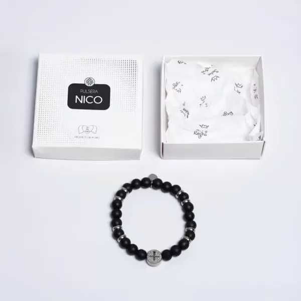 ESCRIPCIÓN Esta pulsera de fimo negro con separadores y un pasante de San Benito de acero en el centro es el accesorio perfecto para añadir un toque de elegancia y protección a tu atuendo. El fimo negro le da un aspecto moderno y versátil, mientras que el pasante de San Benito añade un toque espiritual significativo.