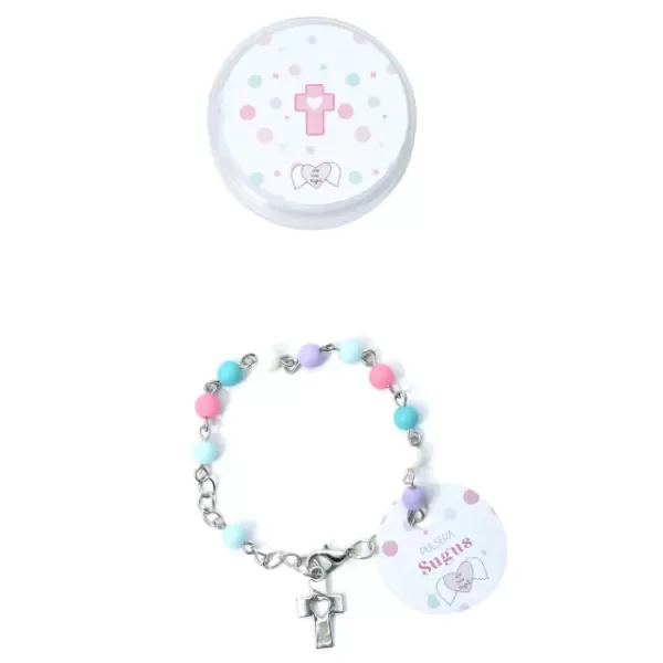 Pulsera tipo decenario de cuentas siliconadas y dije de cruz con corazón calado. Ideal para regalar a niñas.