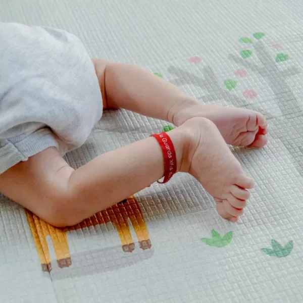 Pulsera tipo cinta en color rojo con la oración del ángel de la Guarda e imagen de un angelito muy simpático. Ideal para bebés.
