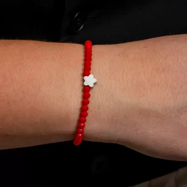 Pulsera elastizada con cuentas de cristal facetado rojo y un pasante de acero con forma de flor en el centro, con packaging divino y presentacion con tarjeta frase: "La alegria es fuerza"✨.