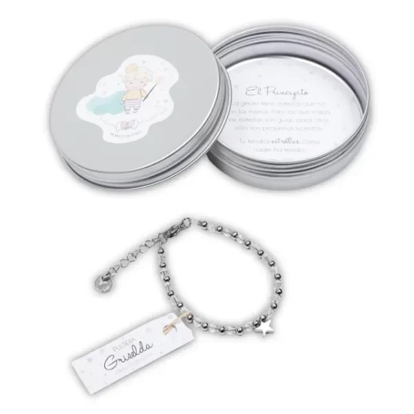 Pulsera de acero con cuentas de cristal tornasolado y estrella pasante, inspirada en El Principito.