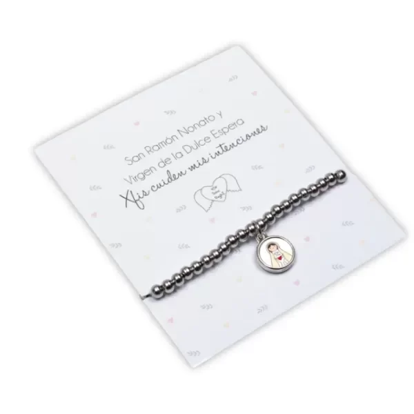 Llená tus días de protección y esperanza con esta pulsera elastizada, compuesta por bolitas de acero de alta calidad. 💫 Incluye un dije con la imagen de San Ramón Nonato (patrono de los niños por nacer y a quién se le intenciona poder formar una familia) y la Virgen de la Dulce Espera que representa cuidado y fe para las futuras mamás. 🤰✨ Acompañada de una hermosa tarjeta diseñada especialmente para que cada persona escriba sus intenciones💖.