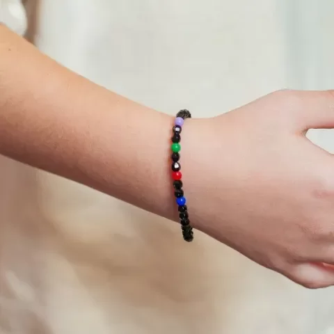 Pulsera elastizada con cuentas en negro, verde, violeta, azul y rojo. Un diseño vibrante para quienes encuentran en cada partida un nuevo desafío y diversión sin límites. Incluye un sticker con la frase "Cada juego es una aventura", ideal para quienes no se cansan de jugar, crear y soñar en grande 🚀