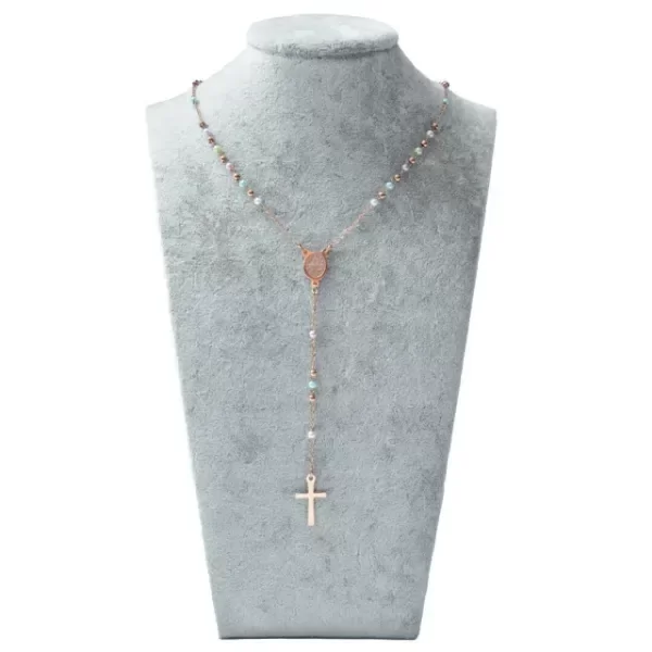 Rosarito de acero quirúrgico rosé y perlitas coloridas de vidrio. Tiene en el centro a la Medalla Milagrosa.