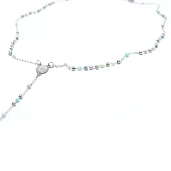 Rosarito de acero quirĂșrgico y perlitas coloridas de vidrio. Tiene en el centro a la Medalla Milagrosa. đEste producto es ideal para regalar en Comuniones o cualquier ocasiĂłn.